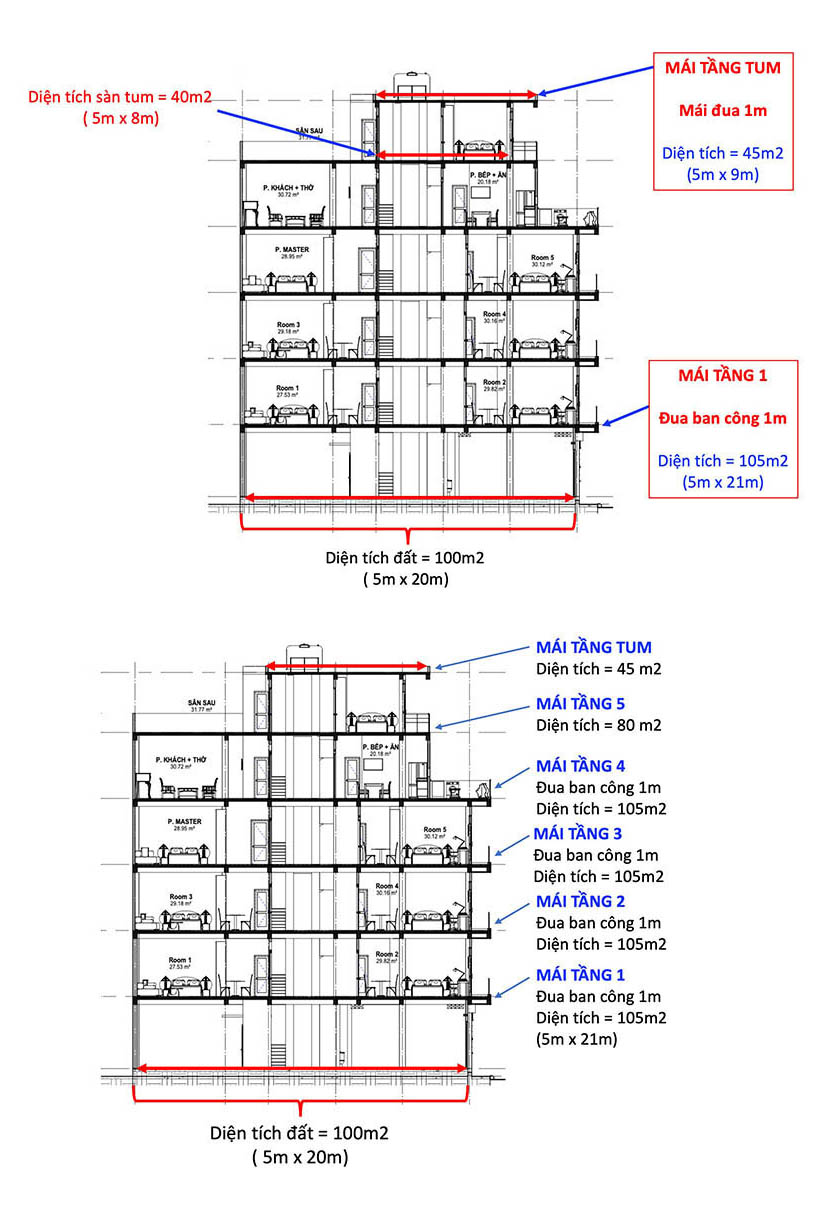 - Tầng 5 chỉ xây khoảng 80m2