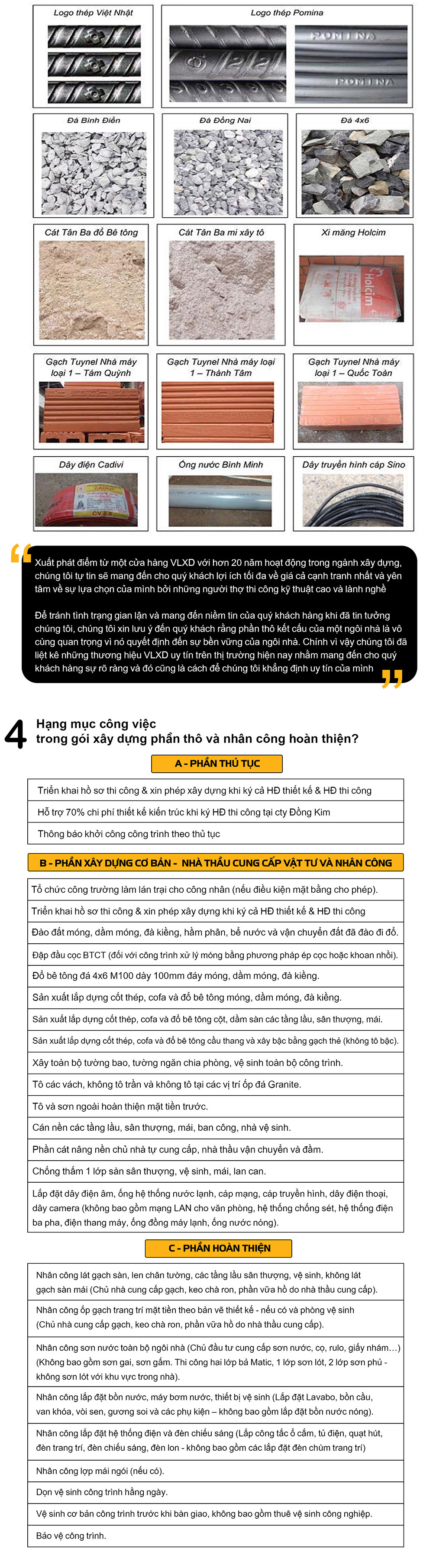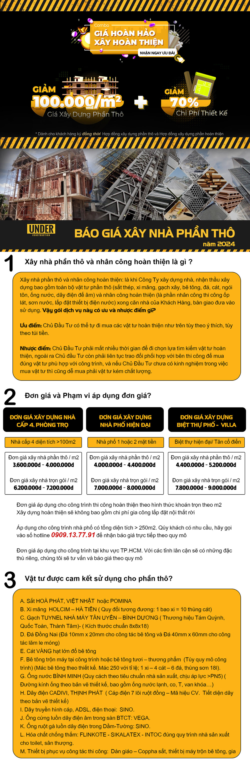 Công ty Thiết kế Xây Dựng Thương Mại Dịch vụ Đồng Kim tự hào là đơn vị vừa thiết kế thi công đa dạng các thể loại công trình: nội thất căn hộ, nhà phố, biệt thự; shop thời trang, showroom,… trọn gói tại TpHCM, vừa kinh doanh các mặt hàng vật liệu xây dựng để đưa đến tay khách hàng những sản phẩm chất lượng, rõ nguồn gốc, giá cả không qua trung gian và bảo hành lâu dài. Chúng tôi xin được gửi đến quý khách hàng bảng báo giá xây thô cùng những vấn đề có liên quan trong quá trình xây dựng. Bảng báo giá thiết kế, thời gian thiết kế, hồ sơ thiết kế, bảng báo giá thi công hoàn thiện sẽ được công ty Đồng Kim cập nhật liên tục tại website: dongkim.com.vn