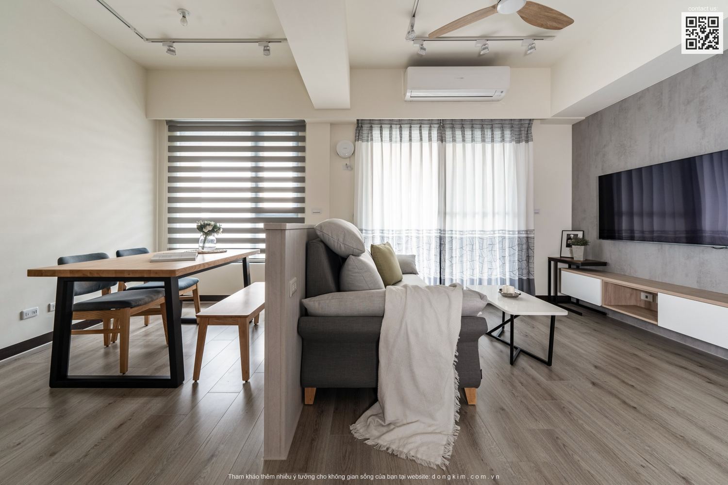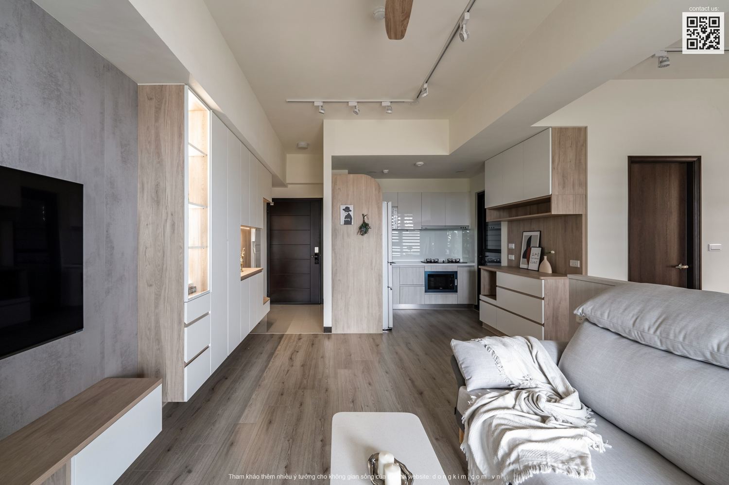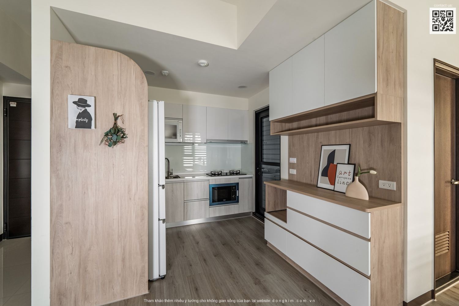 Với diện tích chỉ vỏn vẹn 45m2 thì việc bố trí nội thất sao cho đầy đủ nhưng vẫn đảm bảo sự rộng rãi, thoáng đãng là vấn đề được đặt ra cho các KTS. Do đó, nhằm tối ưu hóa diện tích cũng như mang đến một không gian sống thoải mái, tiện nghi và thời thượng Đồng Kim đã chọn lựa thiết kế nội thất theo phong cách hiện đại cho dự án căn hộ dịch vụ Cailey. Căn hộ lấy tone trắng chủ đạo kết hợp ánh sáng tự nhiên từ cửa kính lớn, điểm xuyết thêm tone màu xanh tươi mát vừa có tác dụng tạo hiệu ứng mở rộng không gian vừa tăng tính thư giãn cho người sử dụng.