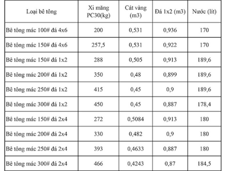 Bảng tra mác bê tông