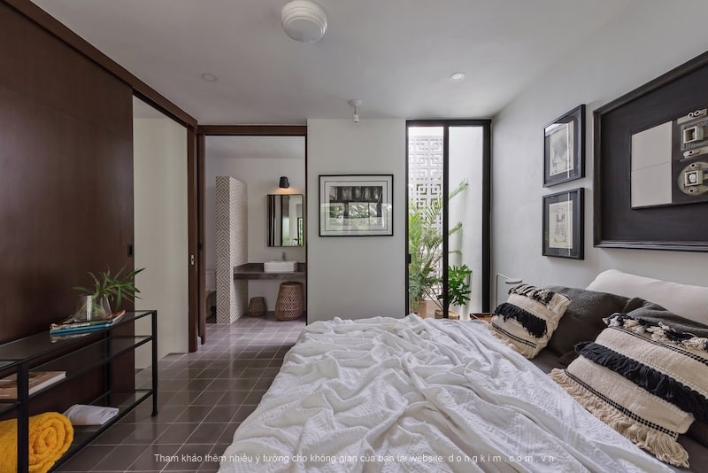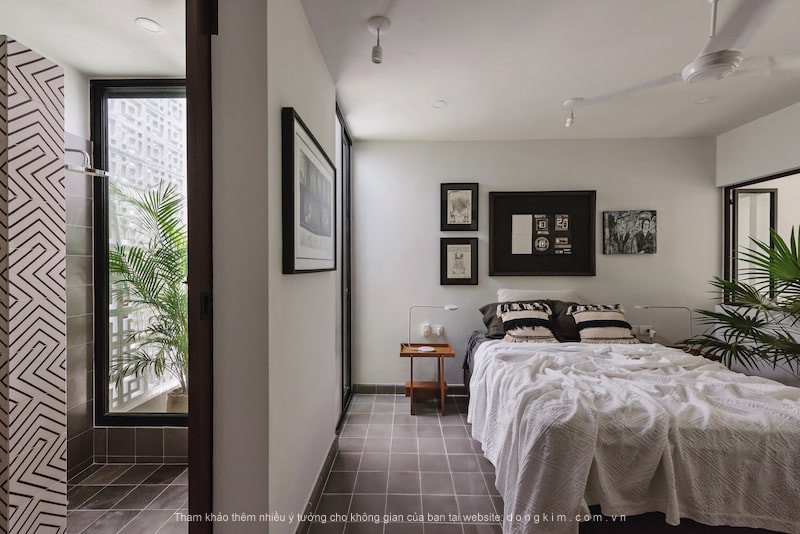 Những bức tường trắng, những chậu cây xanh và nền gạch lát màu xám ấm áp mang đến một bầu không khí ấm cúng, lôi cuốn và ấm cúng cho phòng ngủ.