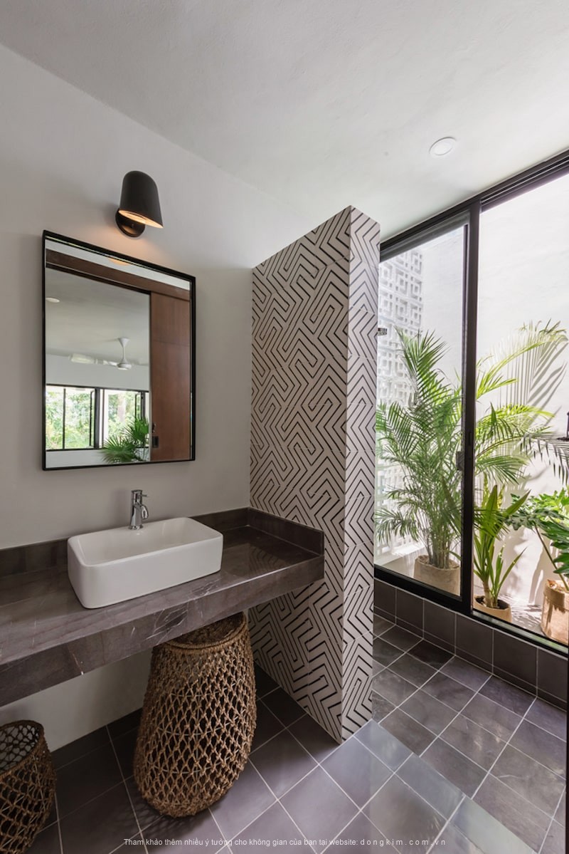 Phòng tắm được mở rộng của chính phòng ngủ, sự tiếp nối của những viên gạch màu xám ấm áp và đặt biệt là khu vực được mở thoáng, không có cửa. Một bức tường ngăn được ốp bằng gạch terazzo, ngăn cách khu vực ướt và khu vực khô.