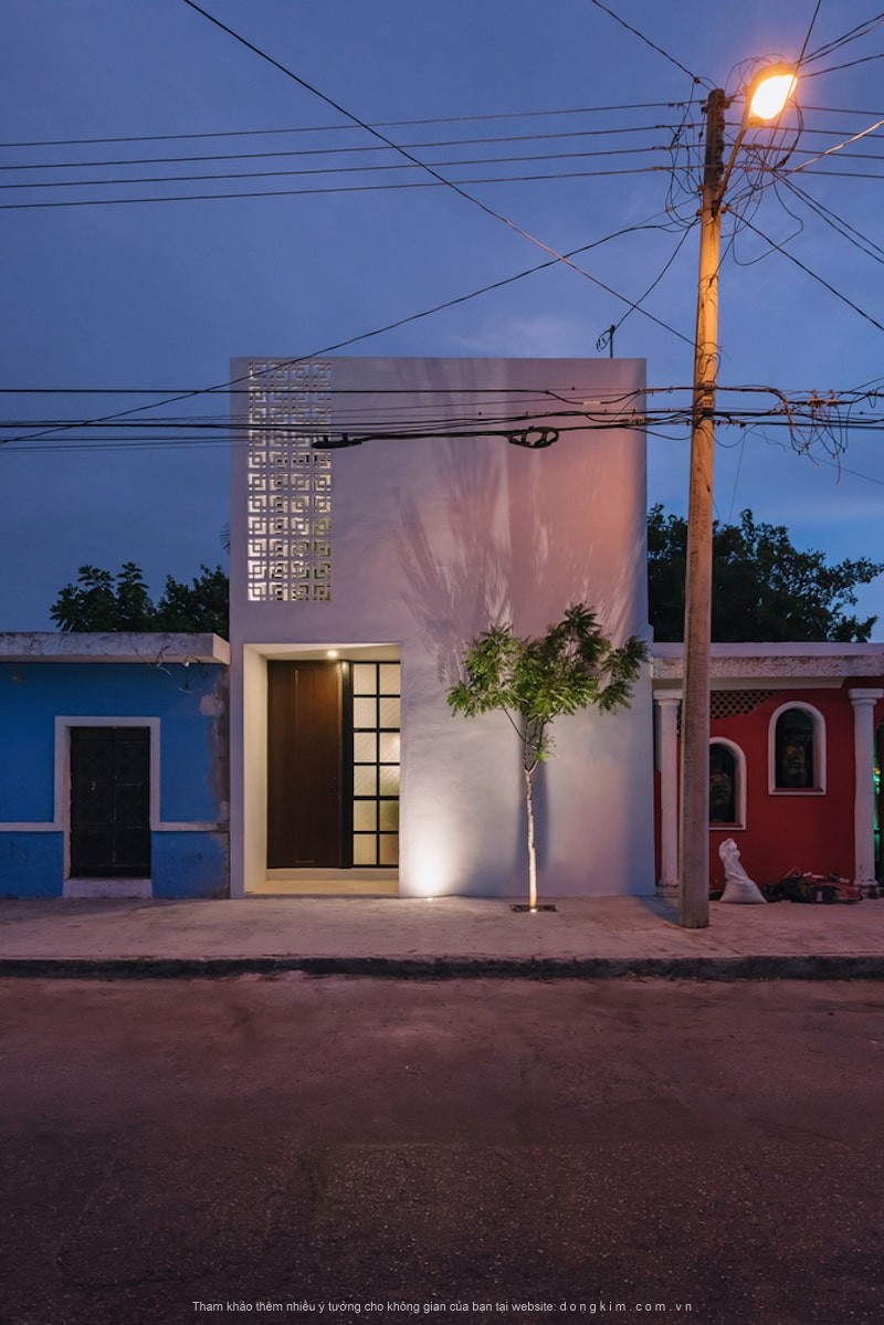 Mặt tiền đã được giữ đơn giản với một thiết kế nhẹ nhàng trên tông màu trắng đơn giản, đồng thời, việc sử dụng các ô gạch bông gió ở tầng thứ hai cho phép không khí đối lưu như một dòng chảy qua nhà, tạo ra một vùng vi khí hậu mát mẻ cho tất cả các không gian bên trong