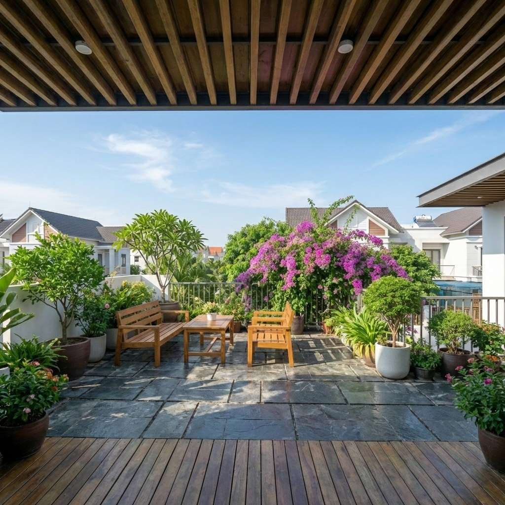 Tầng thượng là nơi tôi rất thích thiết kế, vì đây là không gian “thư giãn” đúng nghĩa. Thường sẽ có phòng thờ phía trước, phía sau là sân thượng để trồng cây, uống trà hoặc làm khu BBQ nhỏ. Với căn góc, sân thượng luôn rất thoáng, nếu làm tốt thì đây sẽ là nơi sử dụng nhiều không kém gì phòng khách.