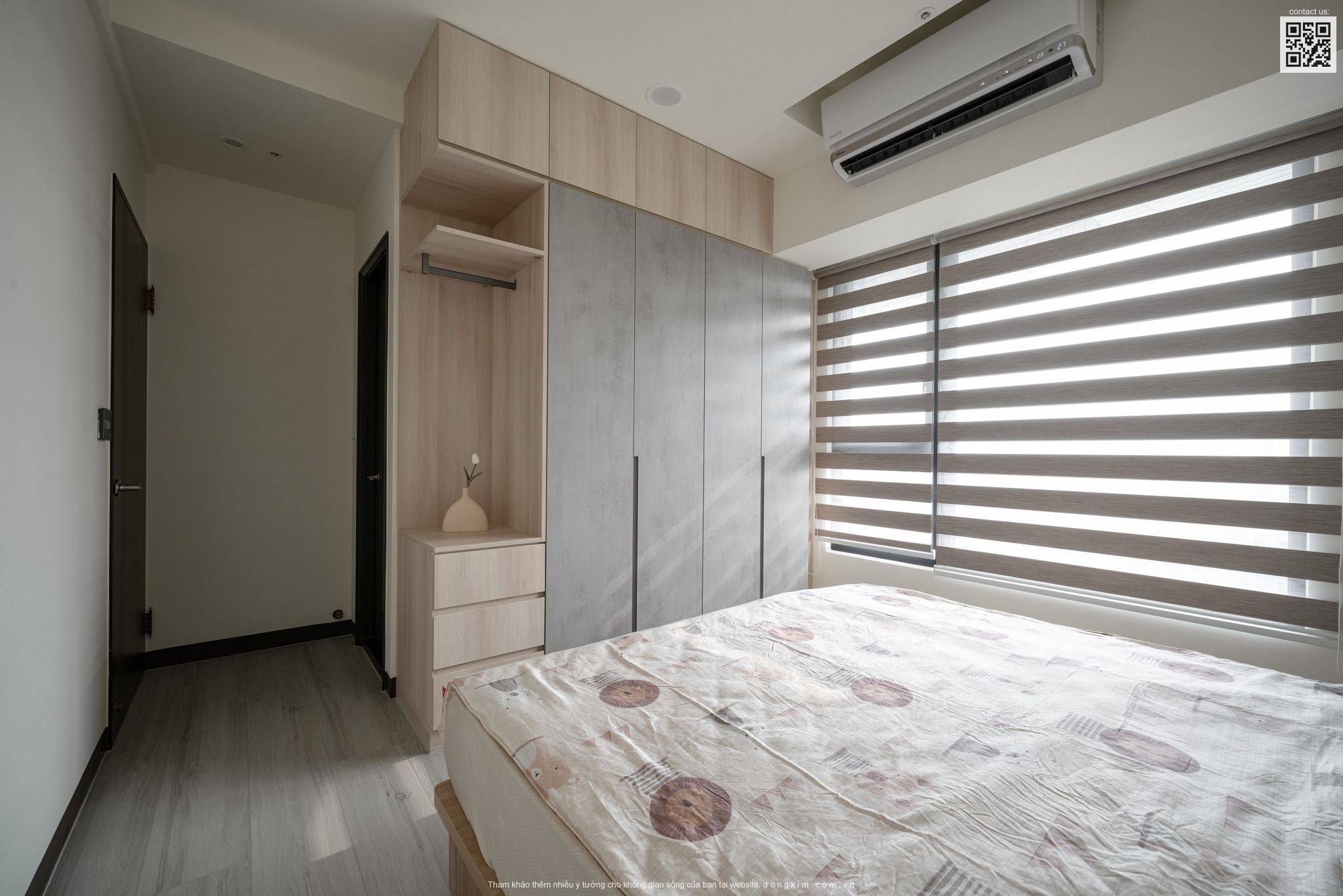 Với tầm view lý tưởng từ trên cao nhìn ra lòng thành phố tấp nập, KTS đã thiết kế hệ cửa kính full trần để có thể tối ưu hóa tầm nhìn cũng như nguồn sáng vào căn hộ. 2 phòng ngủ nhỏ được thiết kế tối ưu tạo không gian riêng cho khách đi nhóm gia đình .