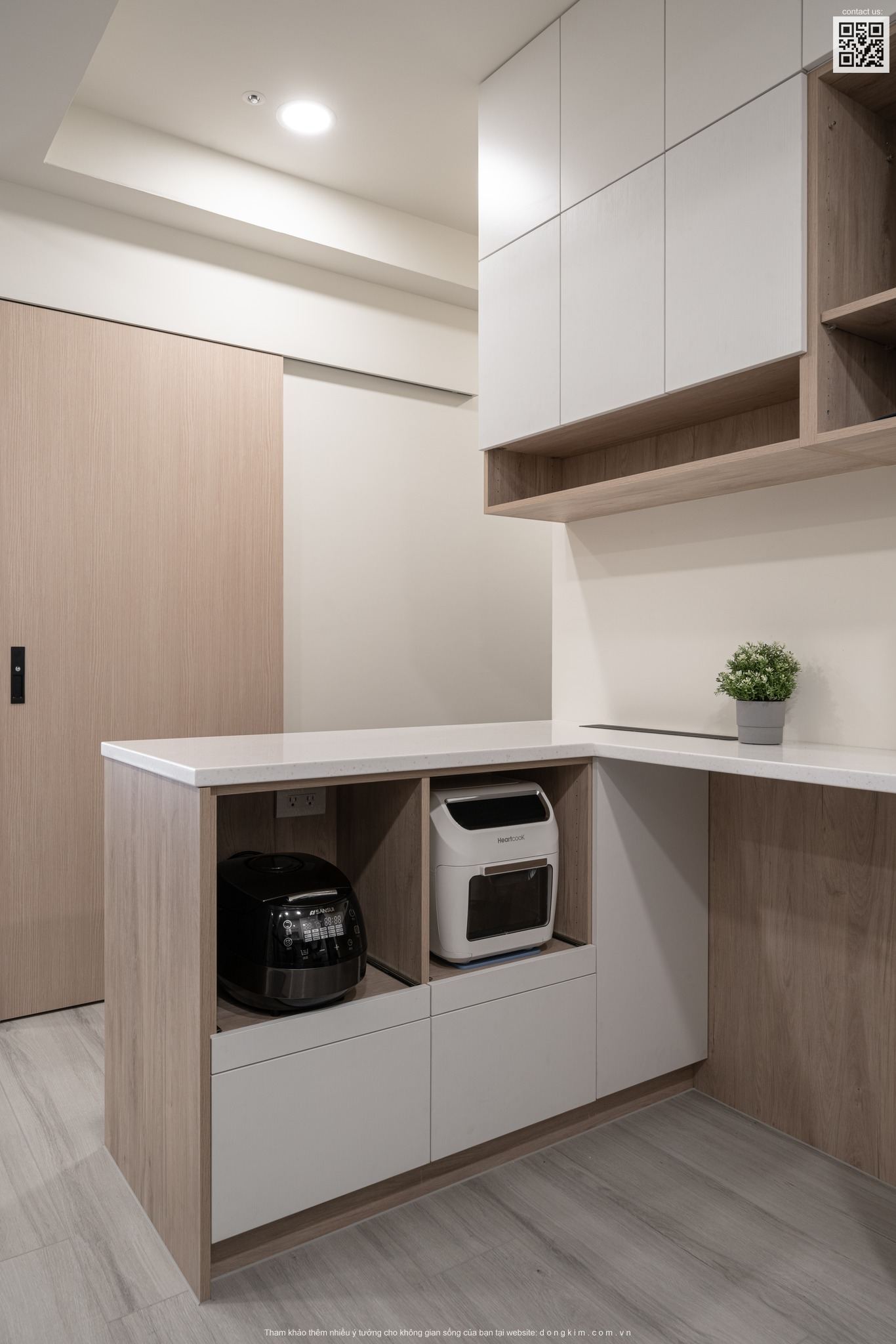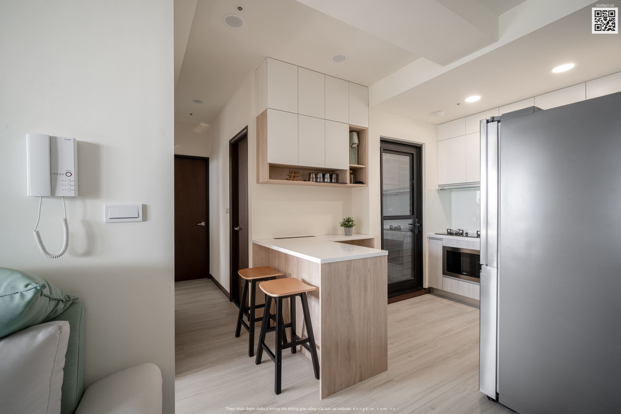 Cạnh bên là khu vực bếp nấu với thiết kế vô cùng độc đáo trông như một quầy bar nhỏ. Bếp được thiết kế theo dạng hình chữ I tích hợp đồng thời cả hệ tủ bếp trên lẫn dưới nhằm làm tăng không gian lưu trữ - một điều vô cùng cần thiết với những không gian nhỏ , Đây được xem là một điểm độc đáo và khác biệt rất đáng để trải nghiệm.