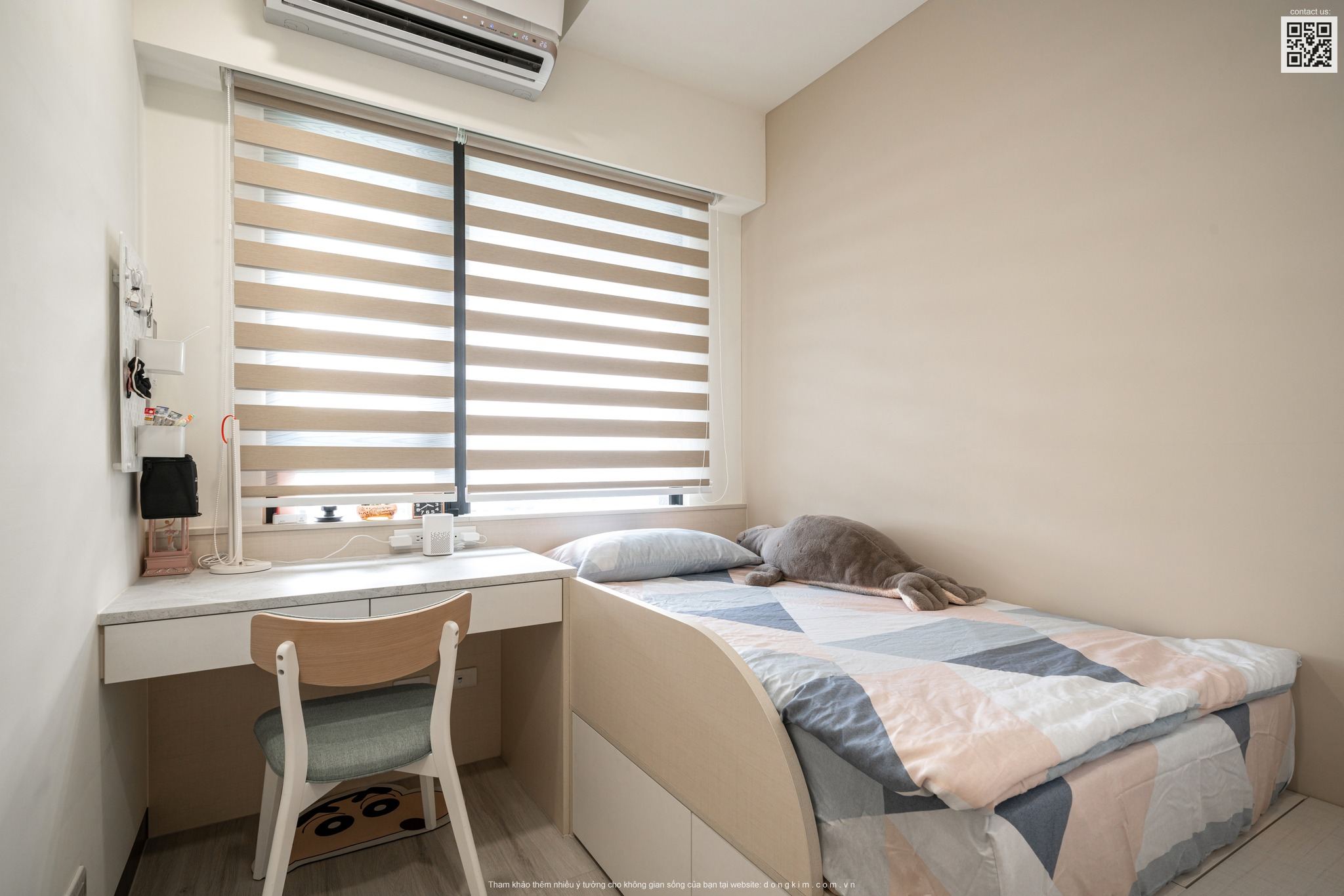 Cạnh cửa kính được bố trí một chiếc ghế sofa tích hợp bàn trà nhỏ gọn với thiết kế đơn giản vừa có thể tiết kiệm diện tích vừa là nơi thư giãn và đón tiếp những vị khách đến thăm nhà. Cạnh khu vực "phòng khách" chính là không gian nghỉ ngơi - khu vực chức năng chính của loại hình serviced apartment