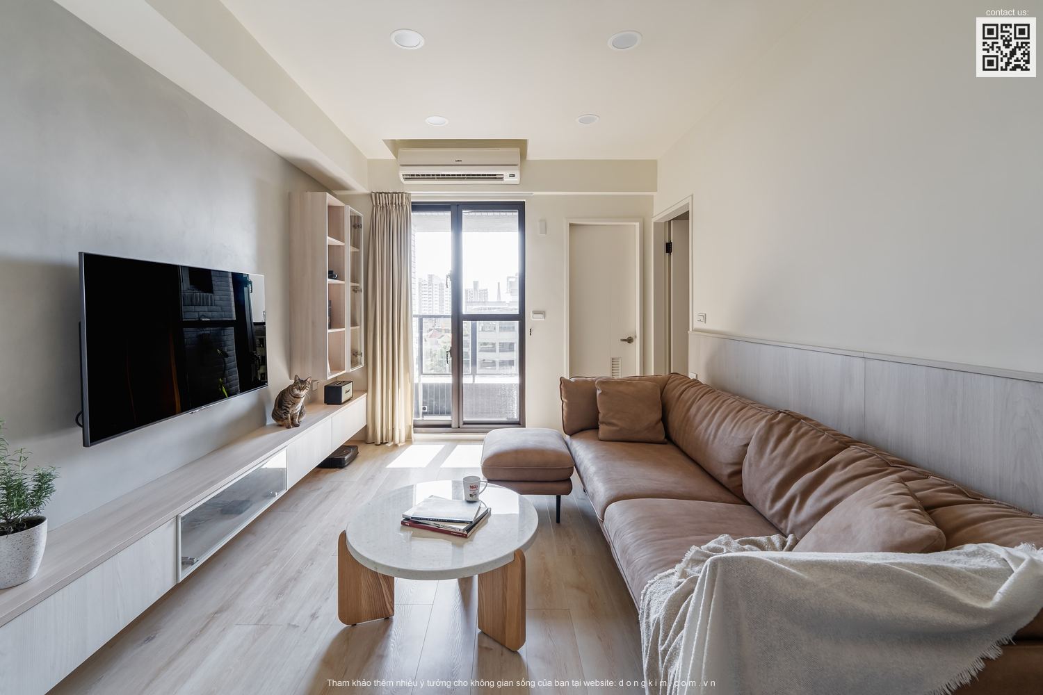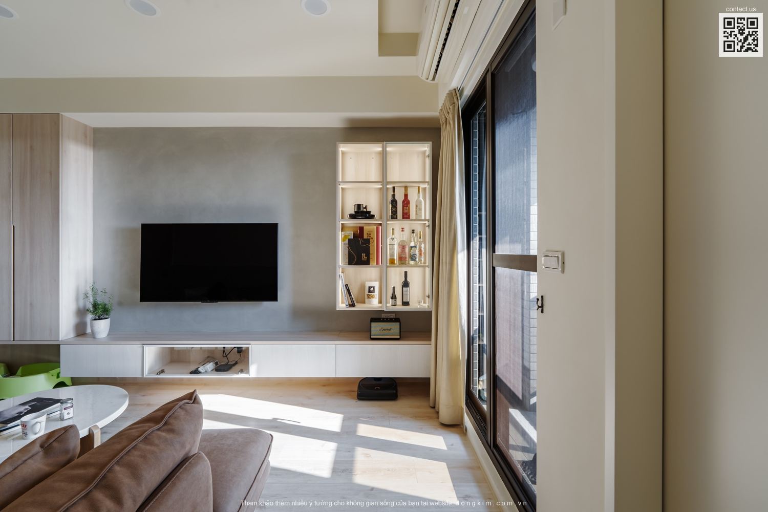 Nếu bạn là một người ưa thích màu trắng thì phòng khách của nhà chị Thịnh sẽ khiến bạn cảm thấy thích thú. Tone màu chủ đạo là màu trắng và màu kem. Trần nhà, tường, sàn đều sử dụng màu trắng. Một bộ sofa màu xám nhẹ nhàng giúp cho căn phòng càng trở nên rộng hơn. Khu vực tường sau kệ tivi có sử dụng gạch ốp với hoa văn giả đá, kết hợp với ốp gỗ một góc giúp cho không gian thêm sinh động hơn.