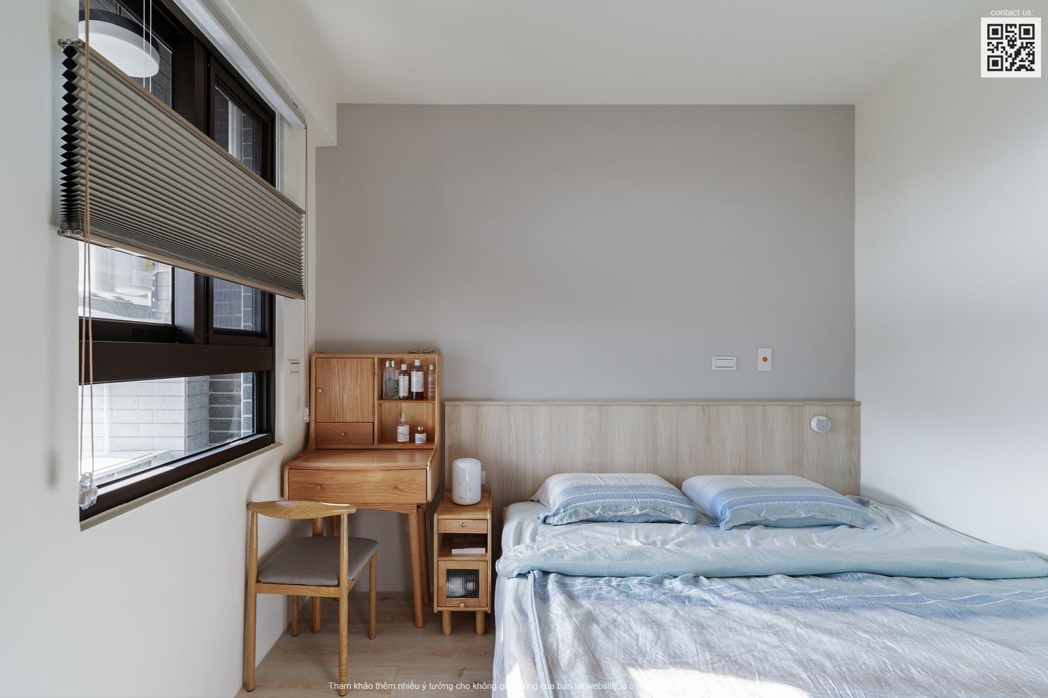 Phòng ngủ master của hai vợ chồng lại thiên về việc phối màu thể hiện sự tinh tế, tuy nhiên chúng không hề đơn điệu một chút nào. Màu xám nhẹ nhàng kết hợp với màu vàng kem là tone màu chủ yếu trong căn phòng. Vách tường đầu giường được ốp gỗ một cách cẩn thận, sử dụng một bức tranh trang trí nhằm giúp không gian thêm đẹp mắt hơn.