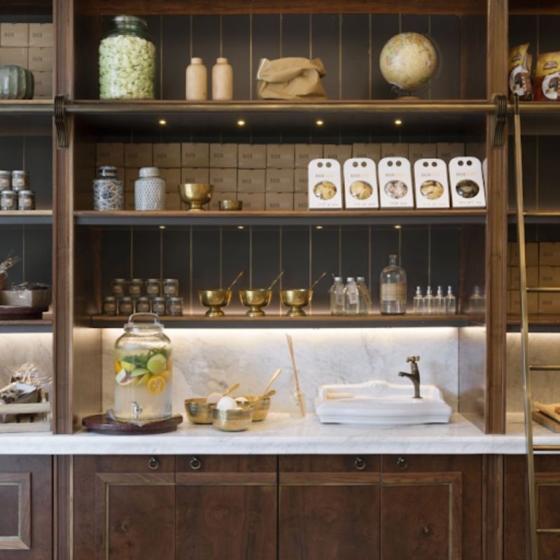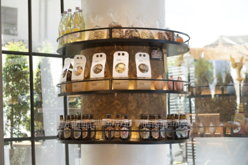 Đây là mẫu tiệm bán bánh ngọt, cafe và đặc sản của Thái Lan. Không gian mang phong cách nhẹ nhàng, gần gũi với tone màu xám chủ đạo. Kệ trưng bày sản phẩm làm bằng gỗ màu tự nhiên sạch sẽ và dễ làm nổi bật hàng hóa. Ở giữa đặt chiếc bàn gỗ thật lớn để đặt những chiếc bánh mới ra lò cho thực khách lựa chọn.